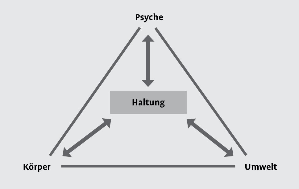 Unsere Erlebnisse wirken von außen auf unser Inneres ein und unsere Reaktion wirkt zurück - wir sind in ständiger Kommunikation mit der Welt. Die Haltung entsteht und verändert sich deshalb immer im Zusammenspiel zwischen Psyche, Körper und der Umwelt. Also stehen auch die innere Haltung und äußere Körperhaltung in enger Verbindung und kommunizieren permanent mit der aktuellen Umgebung. Alle drei Ebenen bieten Möglichkeiten, um die Haltung positiv und gesundheitsförderlich zu beeinflussen, beispielsweise:
